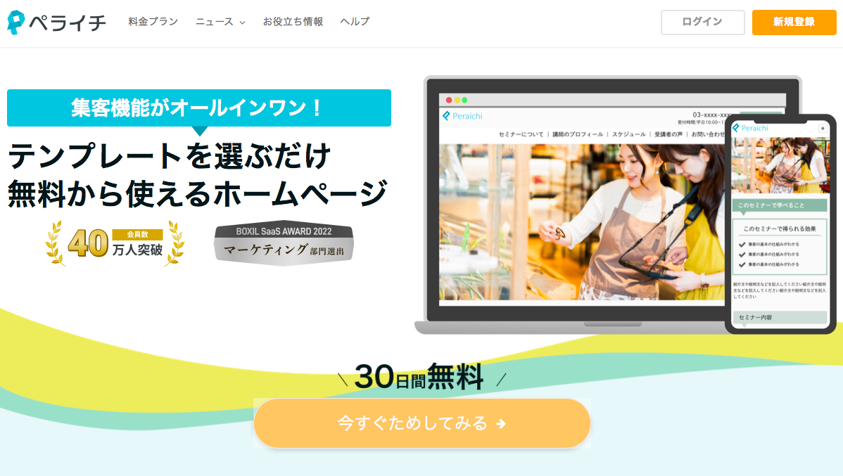 「ペライチ」は決済や予約などの機能を備えた本格的なホームページが、誰でも簡単に作成できるサービス。 累計ユーザー数は30万以上。